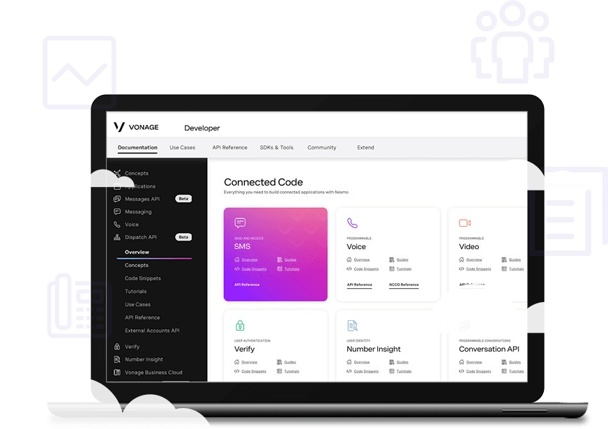 Las soluciones programables de Vonage hacen que cada interacción con el cliente sea una oportunidad. Toma la delantera y aumenta tu alcance, tu compromiso, tu retención, por no mencionar la experiencia global de tus usuarios. Nuestra gama de soluciones incluye: